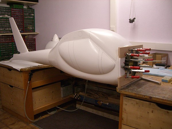 Nach dem Anpassen der Schalldämpferschächte konnten diese dann mit Hilfe von Kohlerovings mit dem Rumpf verklebt werden. Der Motorspannt wurde dann nach der Form der Schächte erweitert, um einen optimalen Kühlluftdurchsatz zu erzielen.